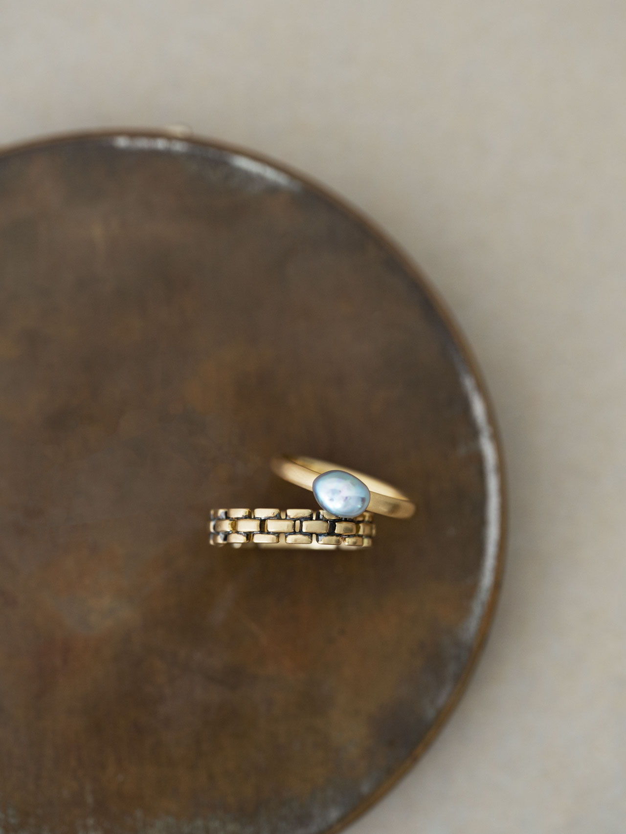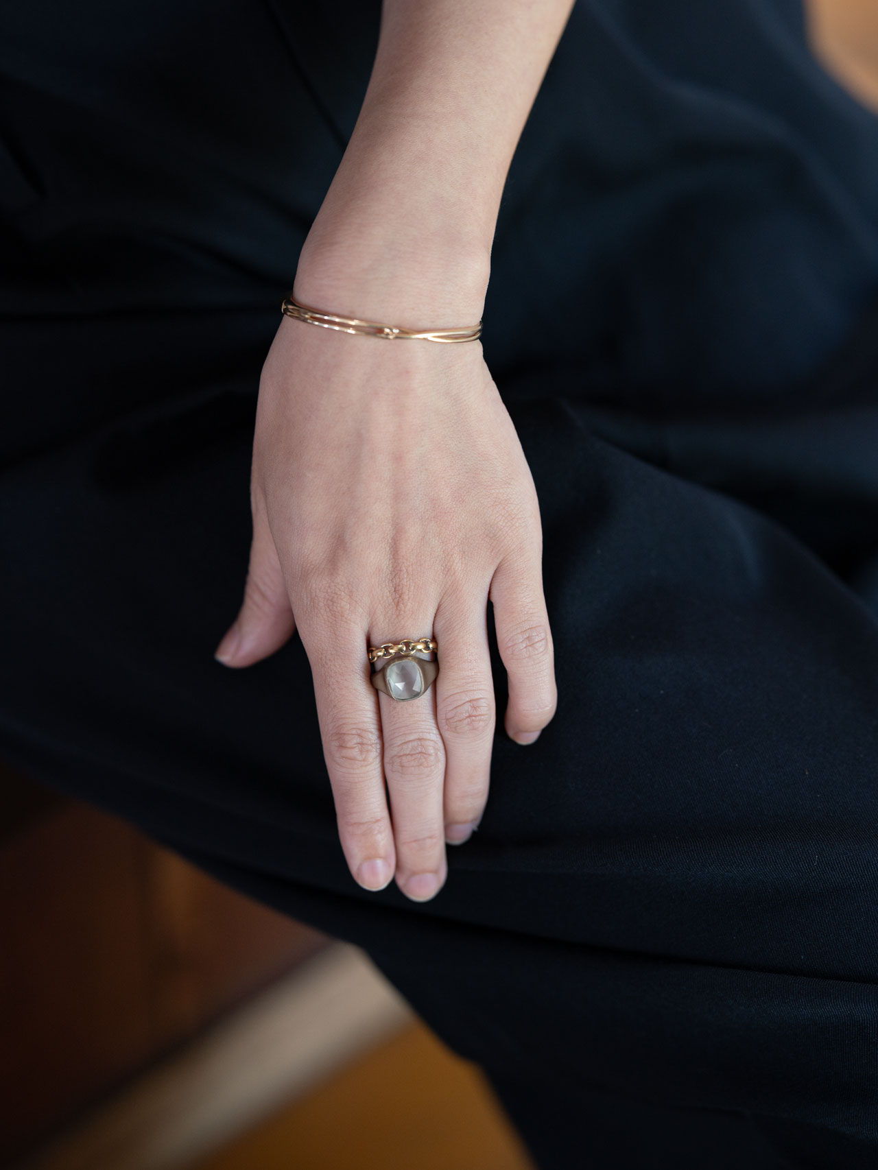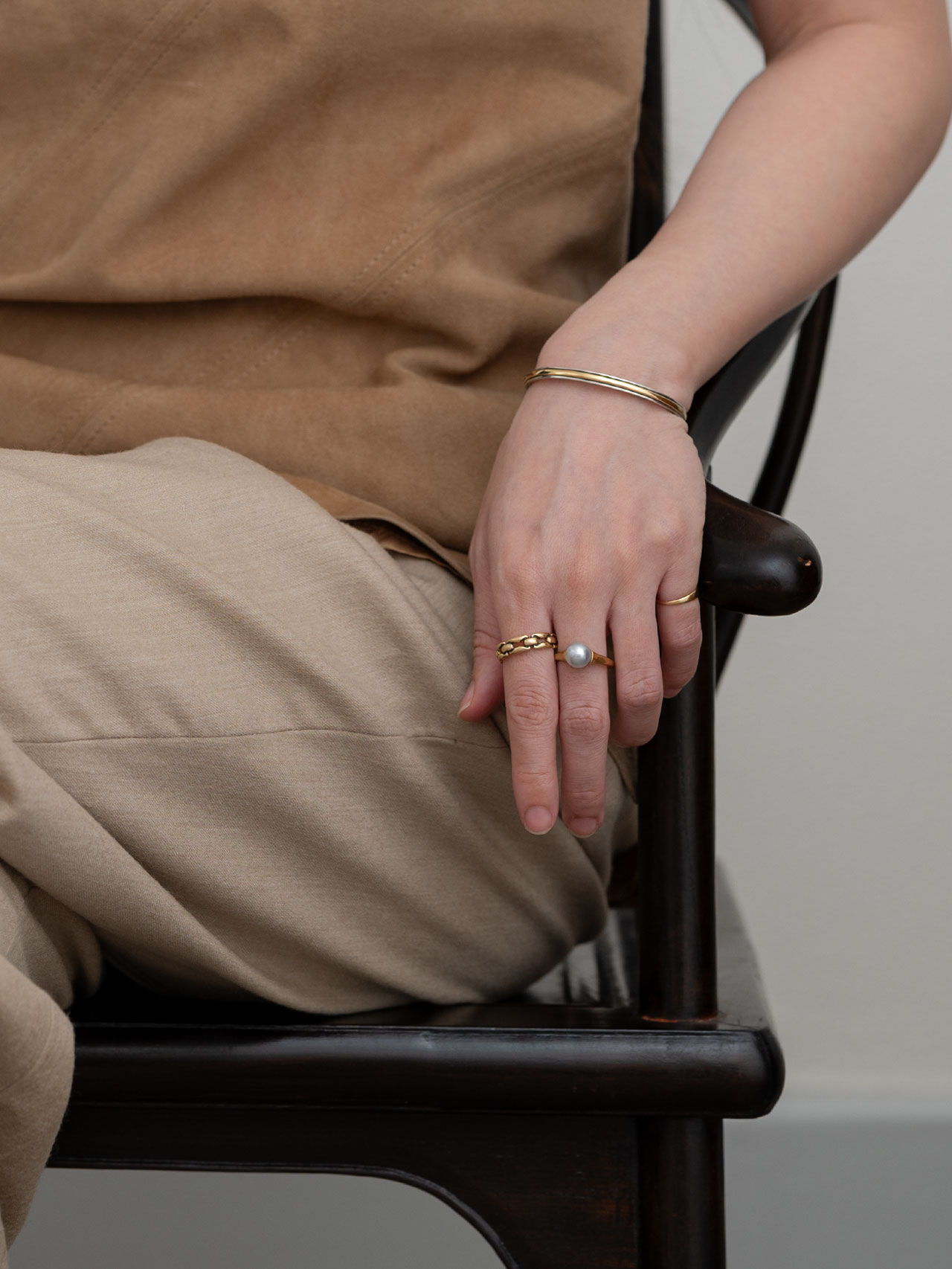 〈Chain〉のほどよいボリュームや、ほのかなクラシックさ、時代に左右されにくい佇まいは、今の自分だけでなく、まだ見ぬ未来の自分にも相応しくなるように。一周近く同じ形を連ねているからこそ、さまざまなものを受けいれてくれる。例えば、若い日の自分が選んできた華奢なものも。過去から今へ、今から未来へ、ずっと繋げてくれるようなアイテムなのだと、アップデートを繰り返しながら強く感じている。