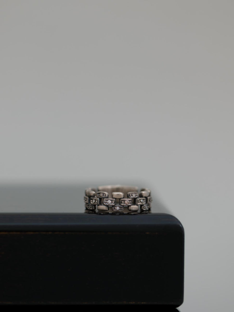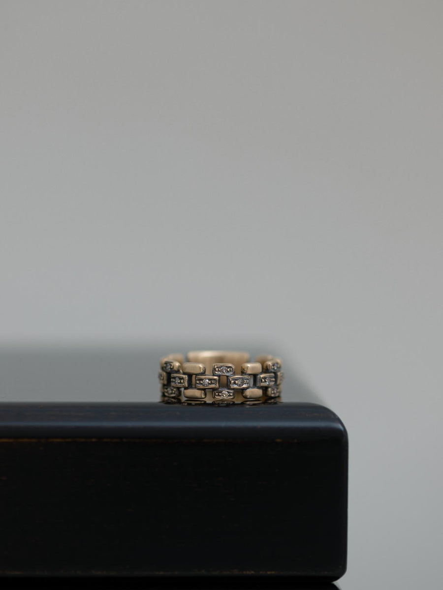 定番のアイテムたちに極小のダイヤを留めて織りなす、’23AWラインナップ。美しさと温もりの調和を求めた作品たちは、彫りや留め方に拘るだけでなくゴールドの余白とその質感も丁寧に作り込まれています。ダイヤモンドは輝きよりもピュアな透明感をもったオールドカットを選んでおり、大小の粒をランダムに、あるいは模様のような規則性をもって彫り留めました。大人らしい粋な遊び心を感じさせるものに。