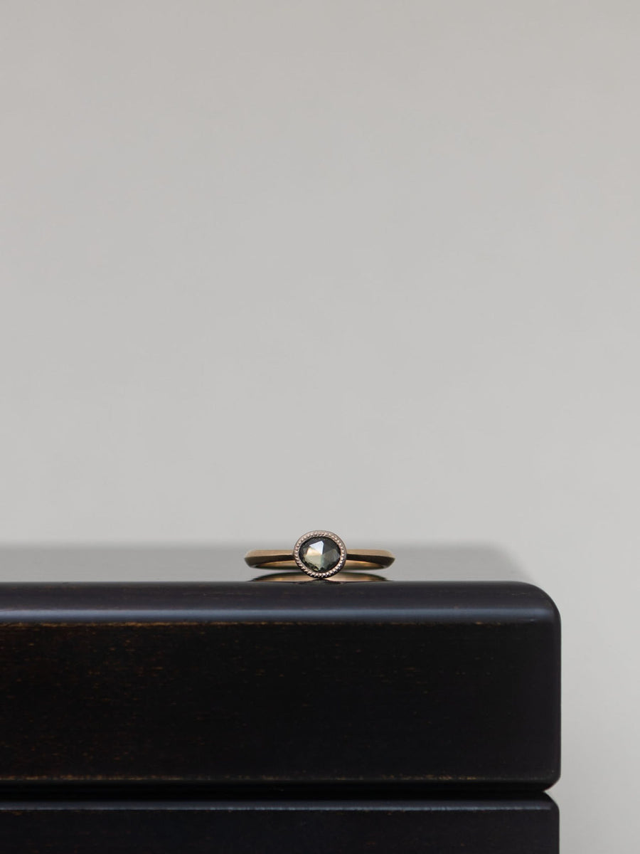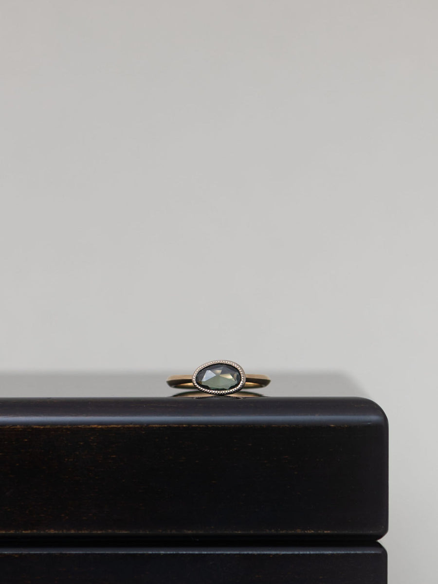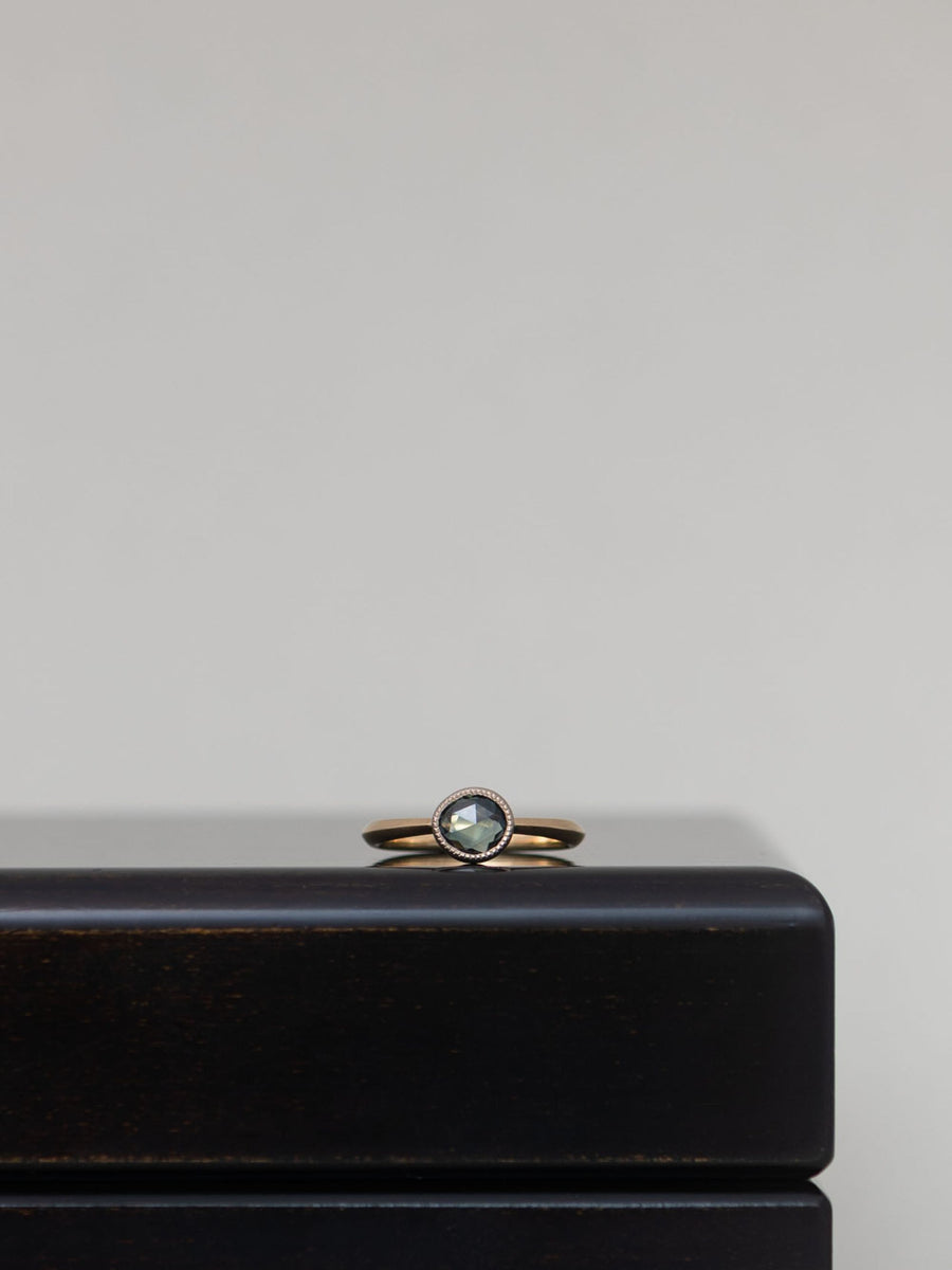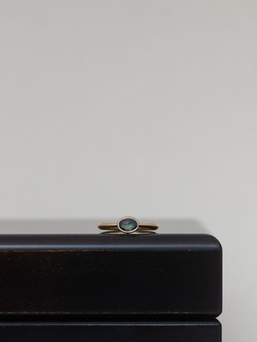 サファイアのリングはサイズやグラデーションがそれぞれに異なります。石の縁取りにはミルグレインを施し、慎ましやかな表情を引き立てます。光の入り方により様々に反射する光沢が瑞々しくも、奥ゆかしい青緑の趣が実に繊細な味わいをもたらしてくれる品々です。