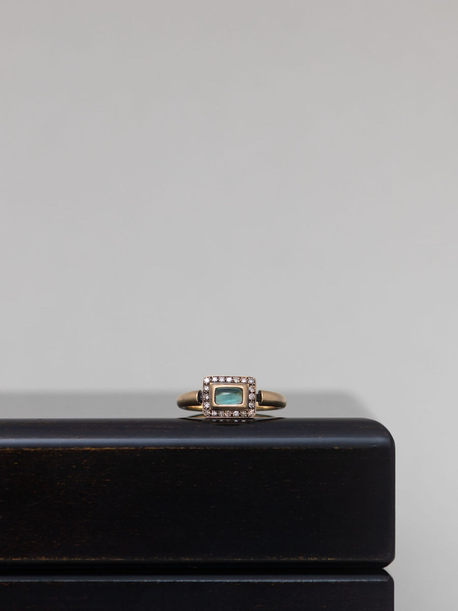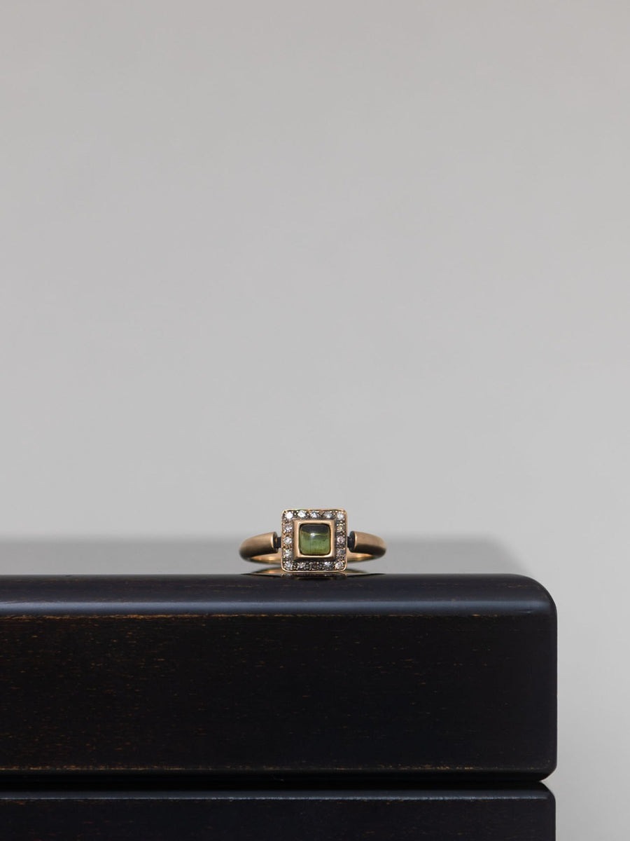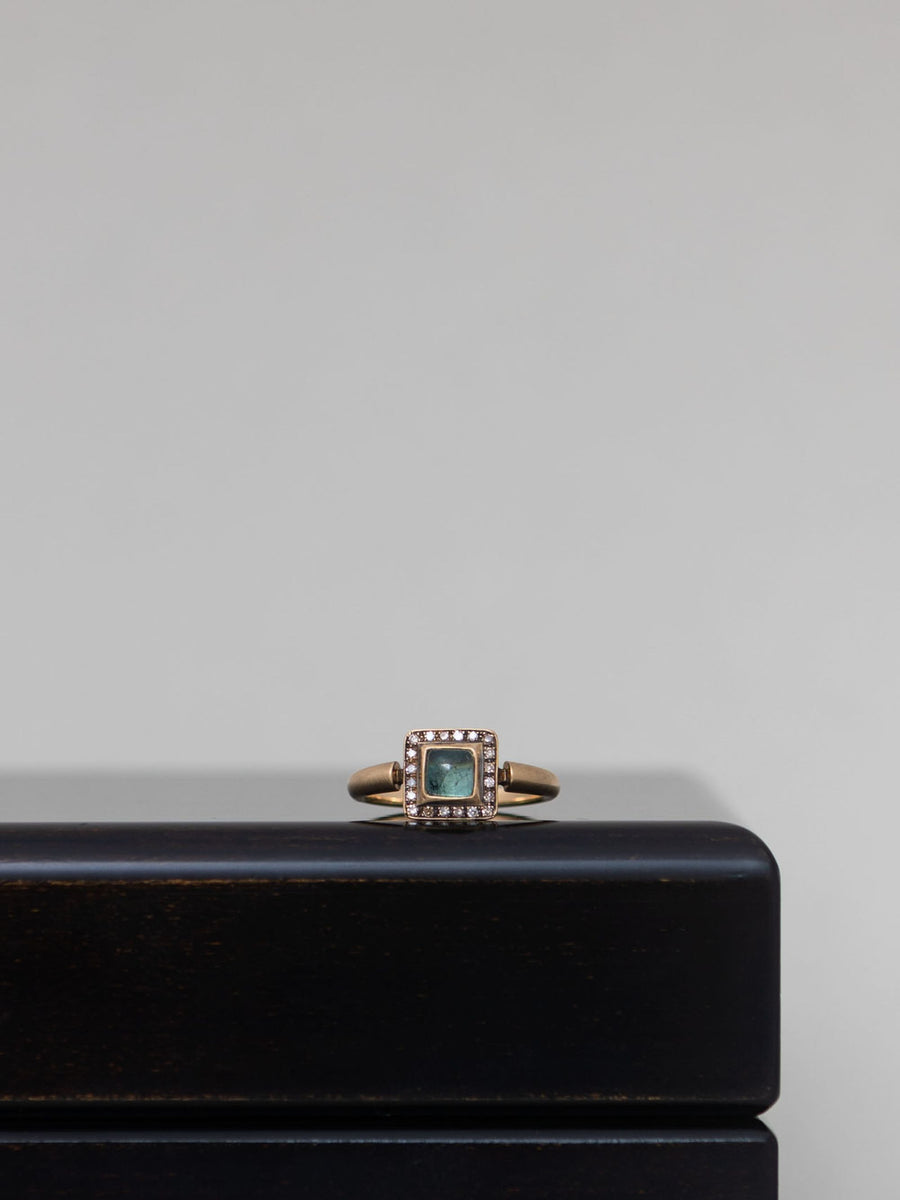 トルマリンの艶と質感を愉しんで頂ける指輪。メレダイヤで留め囲み、華やぎの中に印象的な緑のカラーが重なって目を惹きます。素材のフォルム、カラーのニュアンスも各々ささやかに異なる3点です。ゴールドの腕と相まって大人の手元に凛とした佇まいを見せてくれます。