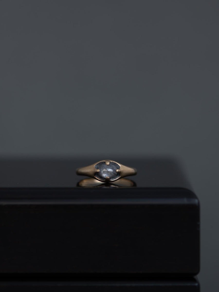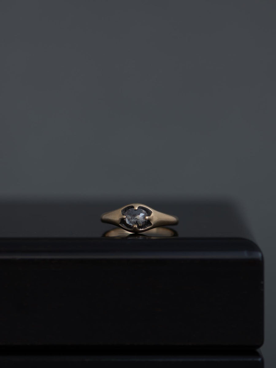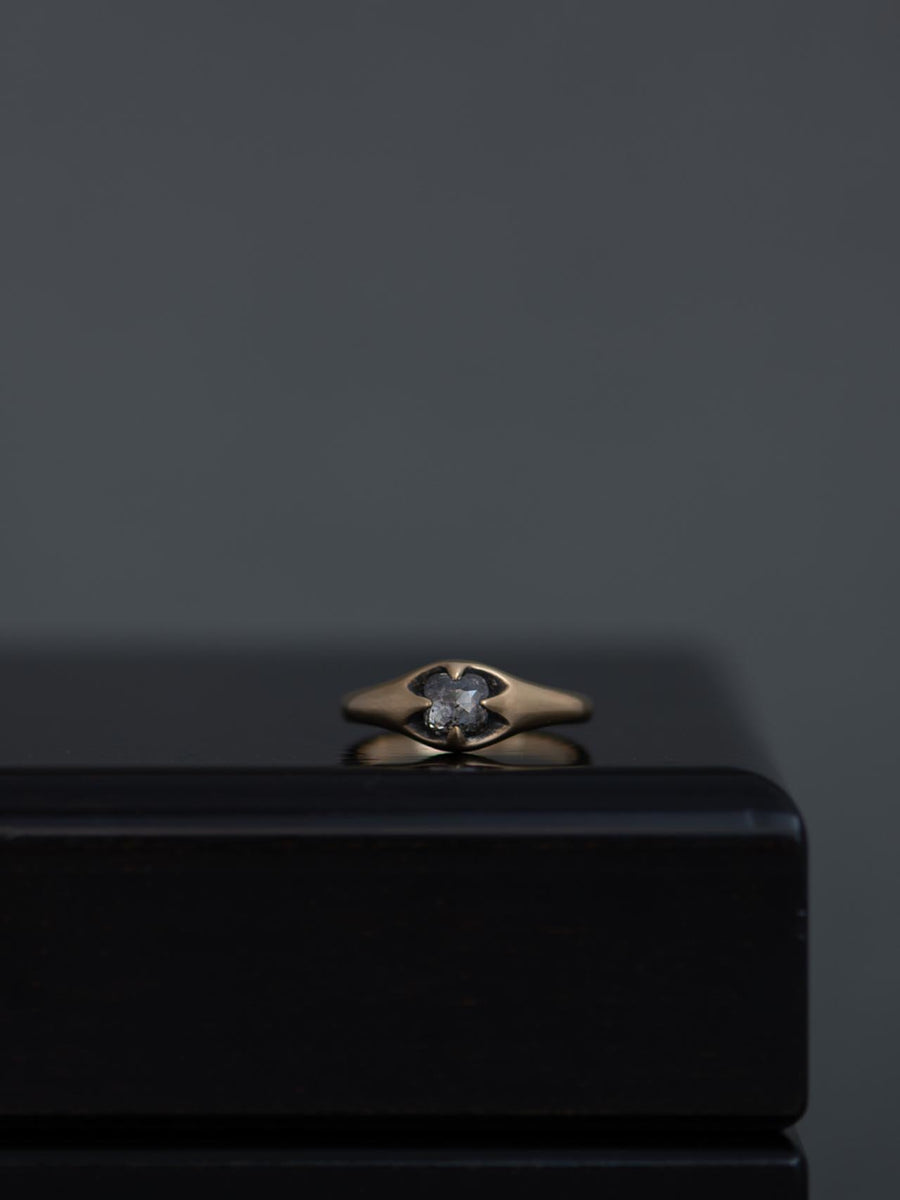 これまでに収集してきた個性豊かなダイヤモンドの中から、無彩色のトーンを感じさせるピースを選り抜き、それぞれの形を活かして一点物に仕立てました。ダイヤの中には自然味のある内包物や柔らかな光の反射が映し出され、透明感や煌びやかさとはまた異なる美しさを醸します。