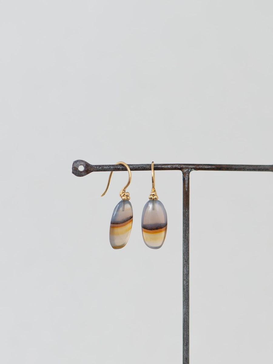 瑪瑙は地球上のあらゆる土地で採掘される、ありふれた鉱物の一つとも言えます。しかしその原石を開いてみるとどれも二つとない表情を見せてくれる、魅力的な存在でもあります。これらは、受注生産品とはまたひと味もふた味も異なる個性を持った瑪瑙たちを、一点一点に似合う形にお仕立てしていったものです。石の輪郭を"額縁"と捉えてみると、中に浮かび上がる縞模様やおぼろげに漂う色層が景色のように感じられ、その具合も様々に映し出されています。石の中に各々の景色を見立てながら、愉しんで身に着けて頂けたら幸いです。