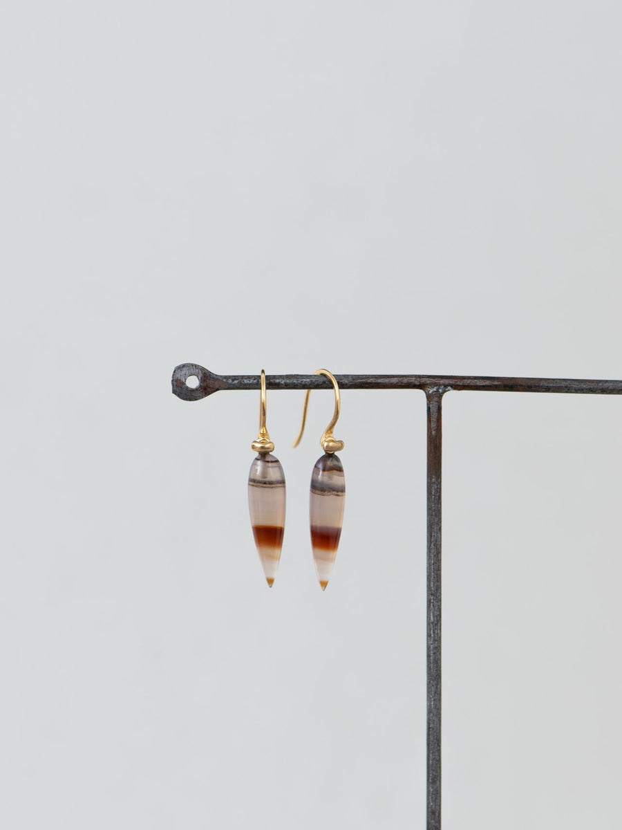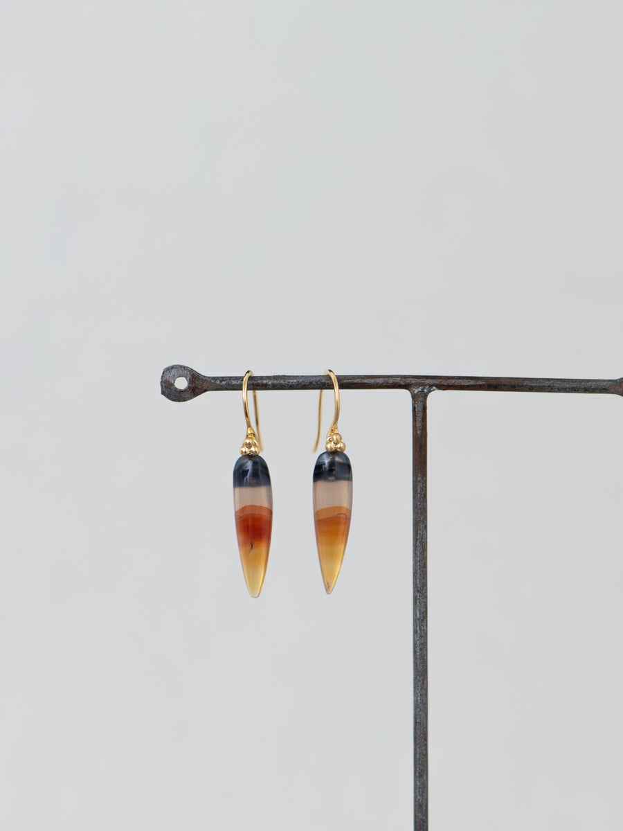 瑪瑙は地球上のあらゆる土地で採掘される、ありふれた鉱物の一つとも言えます。しかしその原石を開いてみるとどれも二つとない表情を見せてくれる、魅力的な存在でもあります。これらは、受注生産品とはまたひと味もふた味も異なる個性を持った瑪瑙たちを、一点一点に似合う形にお仕立てしていったものです。石の輪郭を"額縁"と捉えてみると、中に浮かび上がる縞模様やおぼろげに漂う色層が景色のように感じられ、その具合も様々に映し出されています。石の中に各々の景色を見立てながら、愉しんで身に着けて頂けたら幸いです。