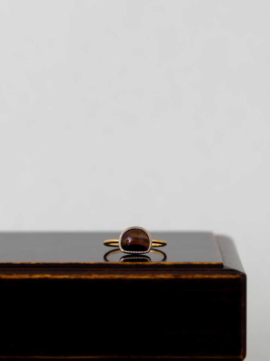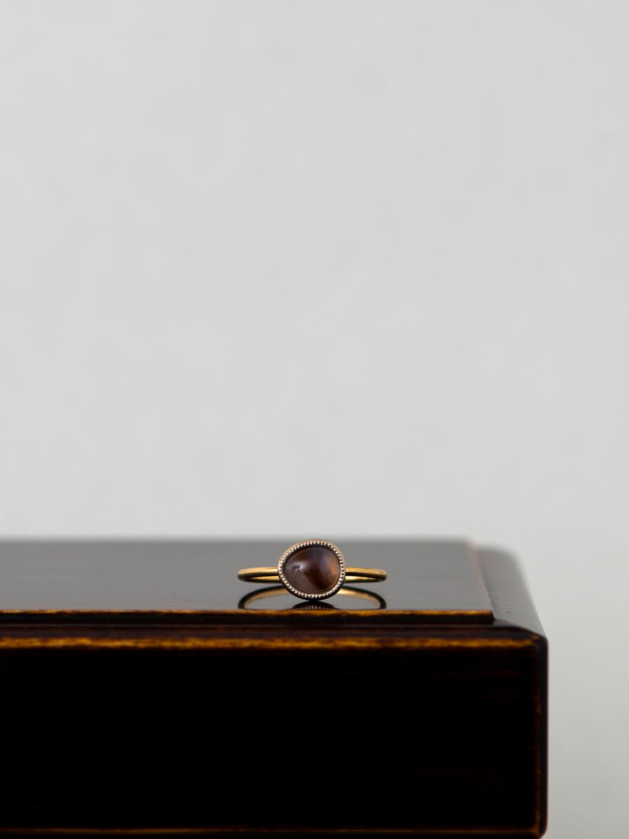 瑪瑙は地球上のあらゆる土地で採掘される、ありふれた鉱物の一つとも言えます。しかしその原石を開いてみるとどれも二つとない表情を見せてくれる、魅力的な存在でもあります。これらは、受注生産品とはまたひと味もふた味も異なる個性を持った瑪瑙たちを、一点一点に似合う形にお仕立てしていったものです。石の輪郭を"額縁"と捉えてみると、中に浮かび上がる縞模様やおぼろげに漂う色層が景色のように感じられ、その具合も様々に映し出されています。石の中に各々の景色を見立てながら、愉しんで身に着けて頂けたら幸いです。
